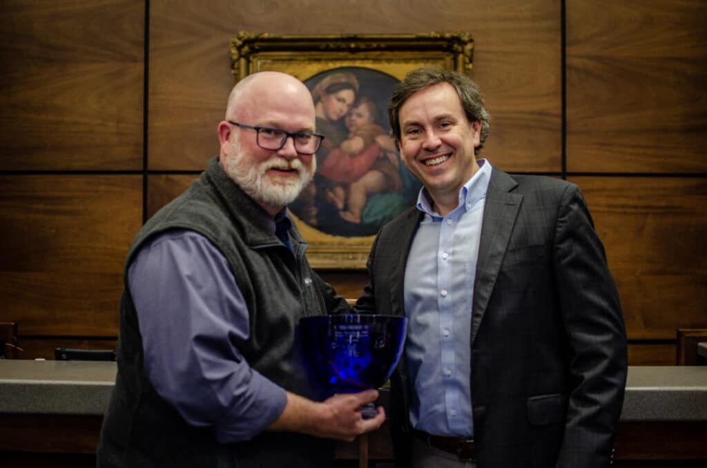 In addition to this honor, the recipient of this award also receives the Aquin Cup. Catherine McAuley believed deeply in the power of a “comfortable cup of tea,” the idea that hospitality and care often begin with noticing and responding to what someone needs in the moment. The Aquin Cup symbolizes that same way of showing up. And Todd shows us, again and again, what that looks like in practice.